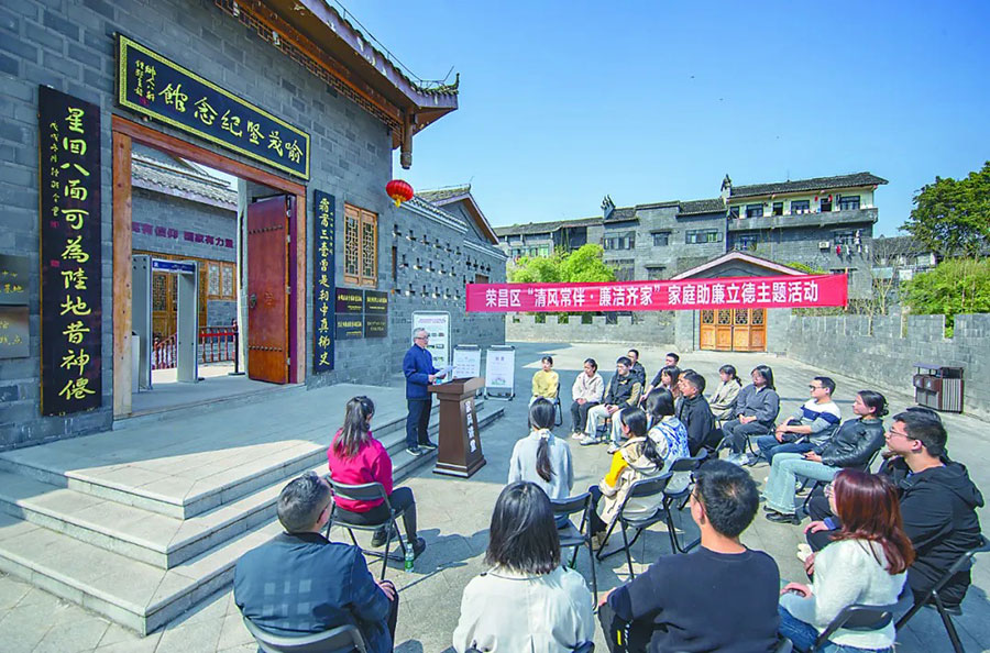重庆市荣昌区纪委监委联合区妇联等单位开展“清风常伴·廉洁齐家”家庭助廉立德主题活动,教育引导党员干部注重家庭家教家风建设。图为近日,讲解员在喻茂坚纪念馆门前为党员干部及其家属讲述喻氏家族清廉家风故事。张春连 摄